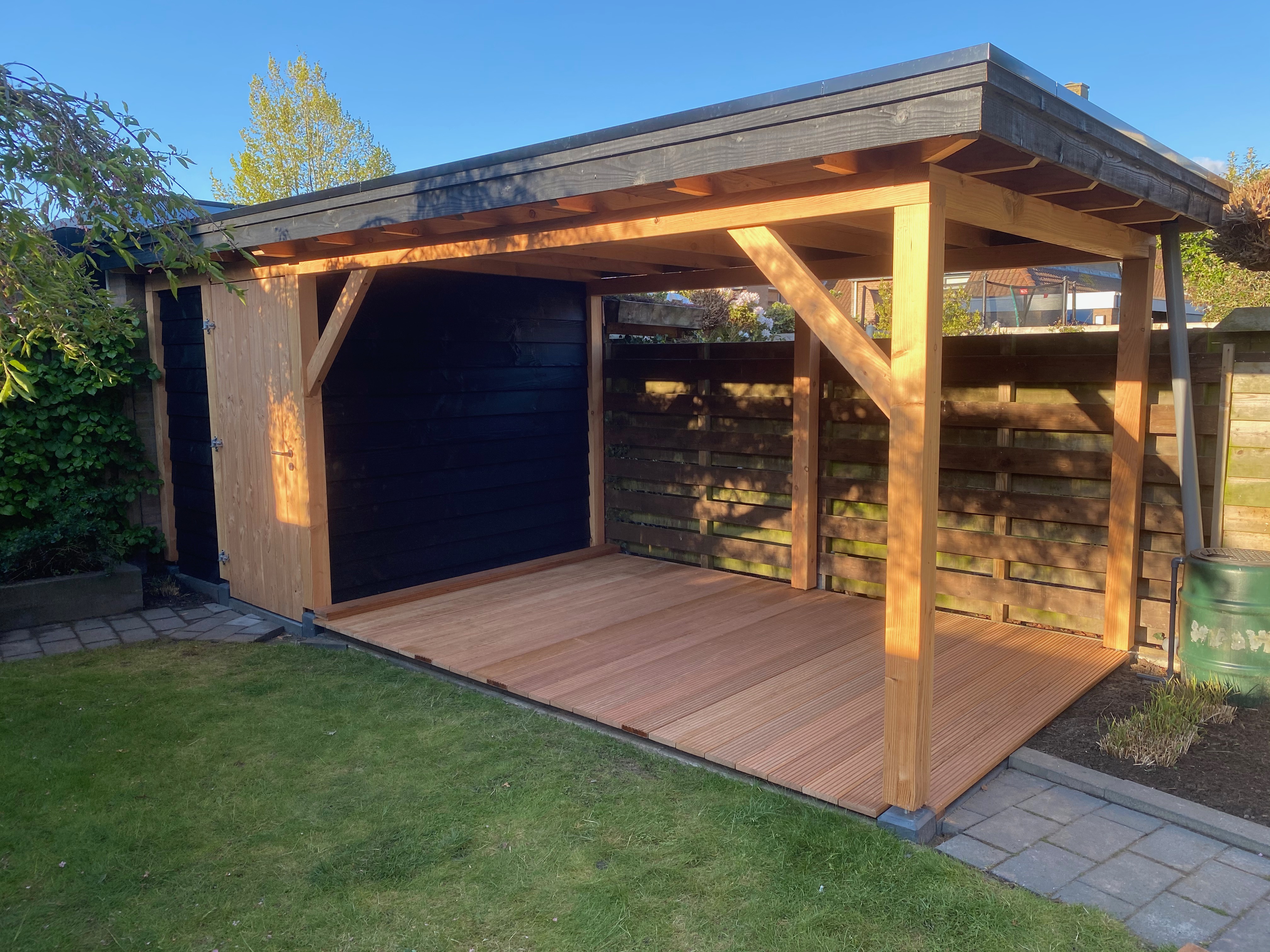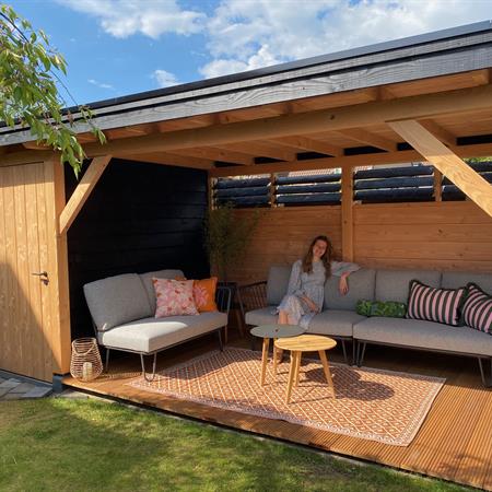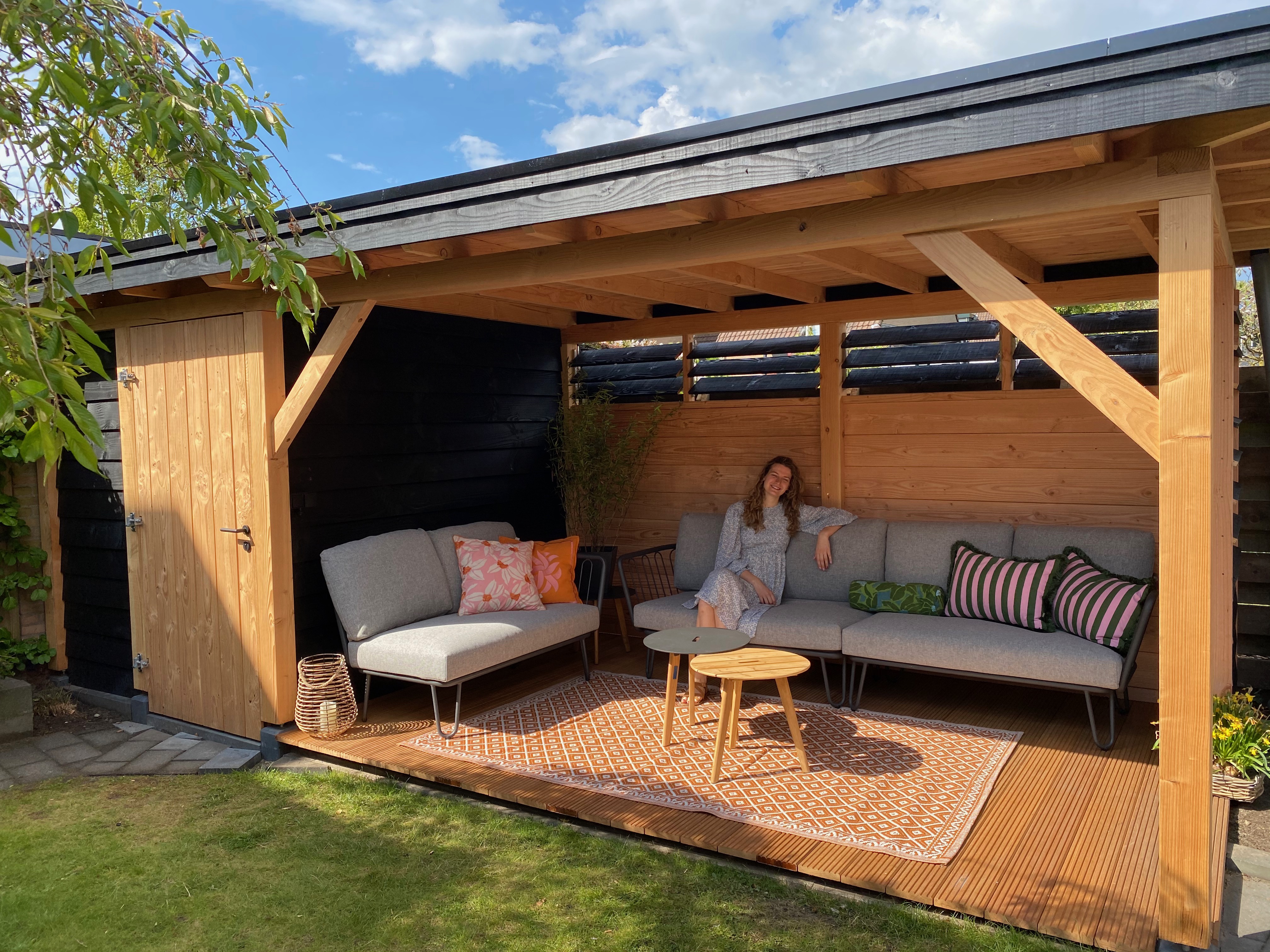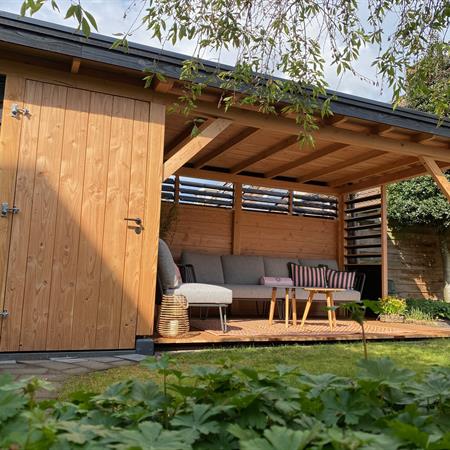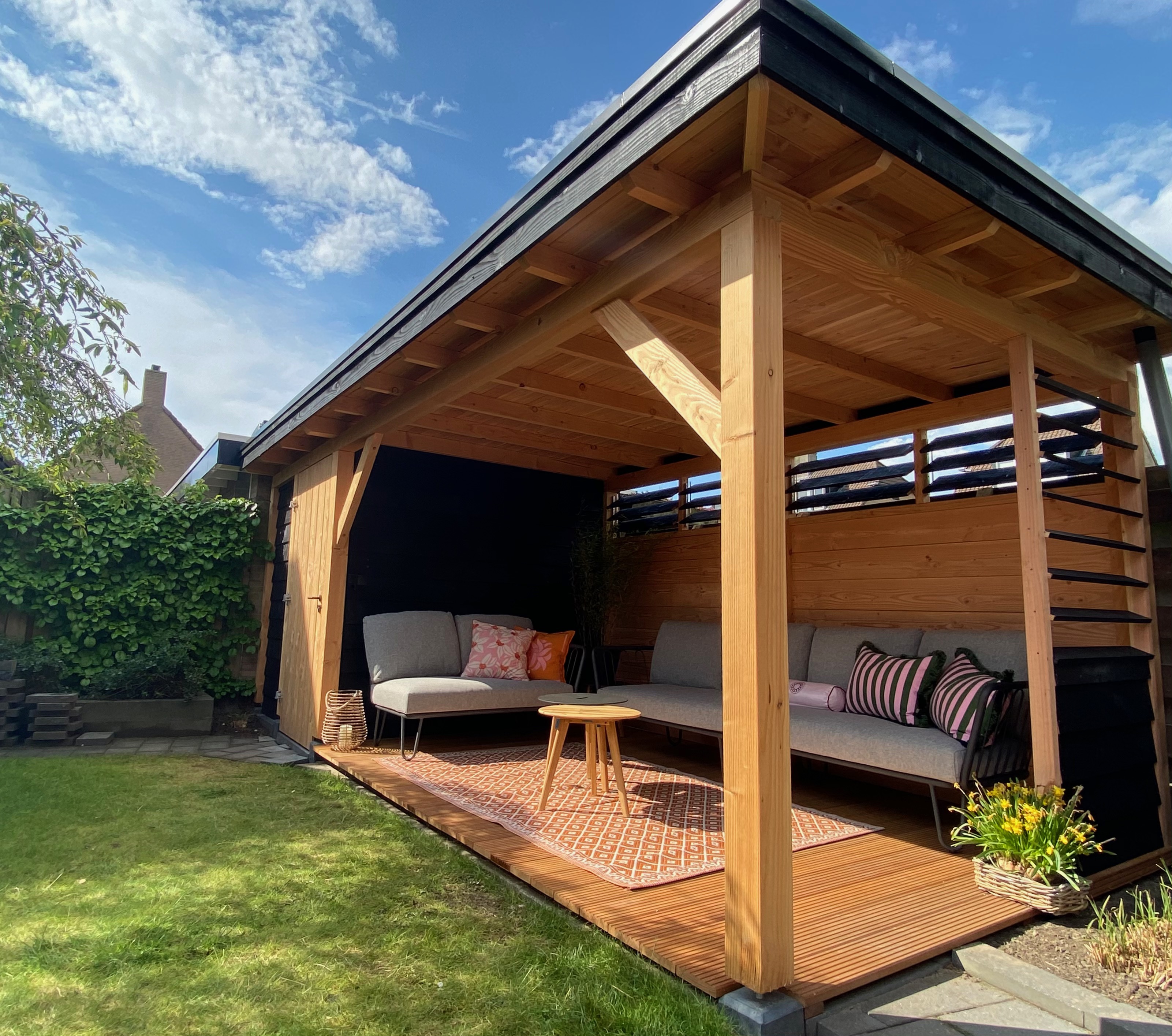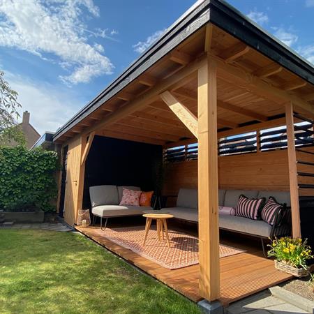 Geheel op maat en naar eigen smaak en inzicht is een luxe tuinoverkapping gebouwd. Geschaafde houten draagconstructie, dakoverstek voorzien van zwarte daktrim. Na het monteren van de hardhouten vlonderplanken is het geheel ingericht met een outdoor lounge-set incl. verlichting en accessoires.