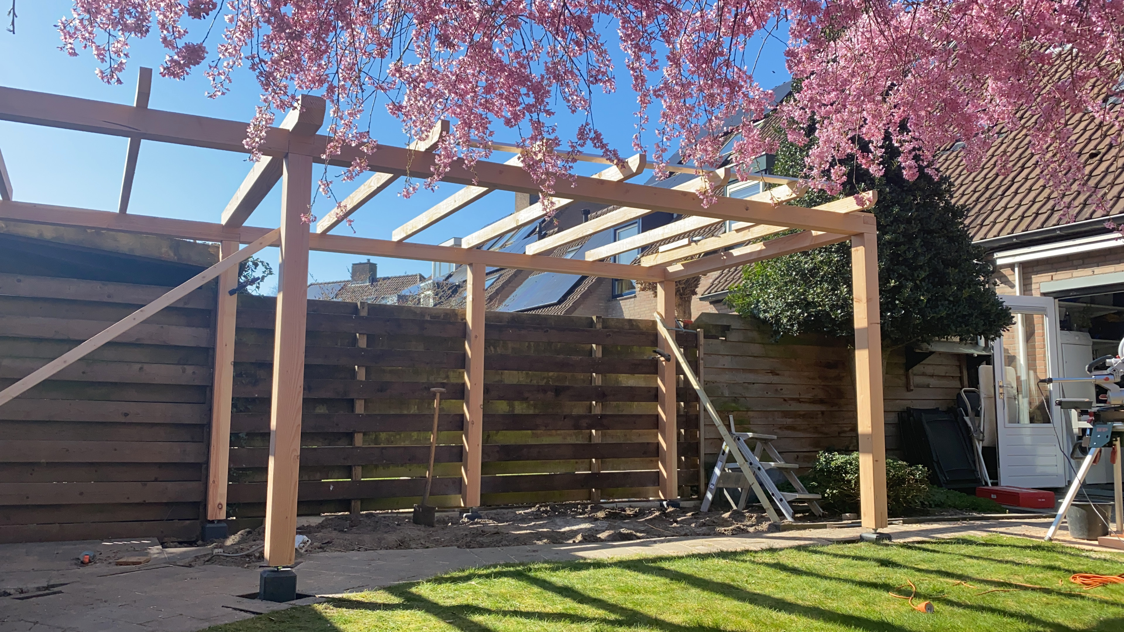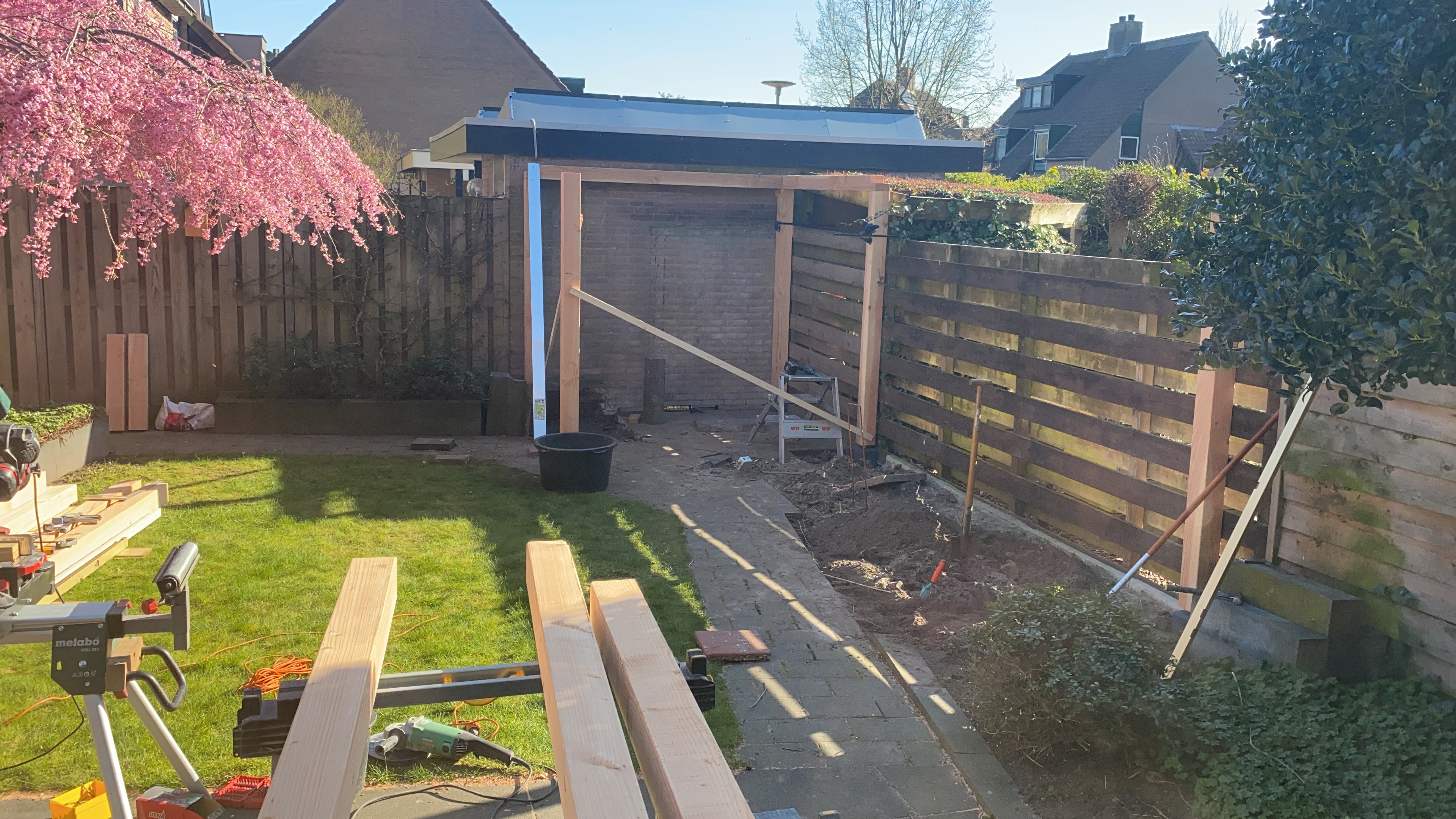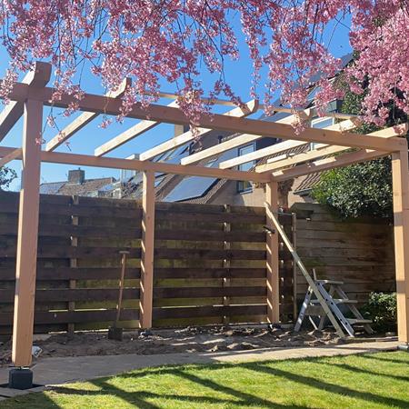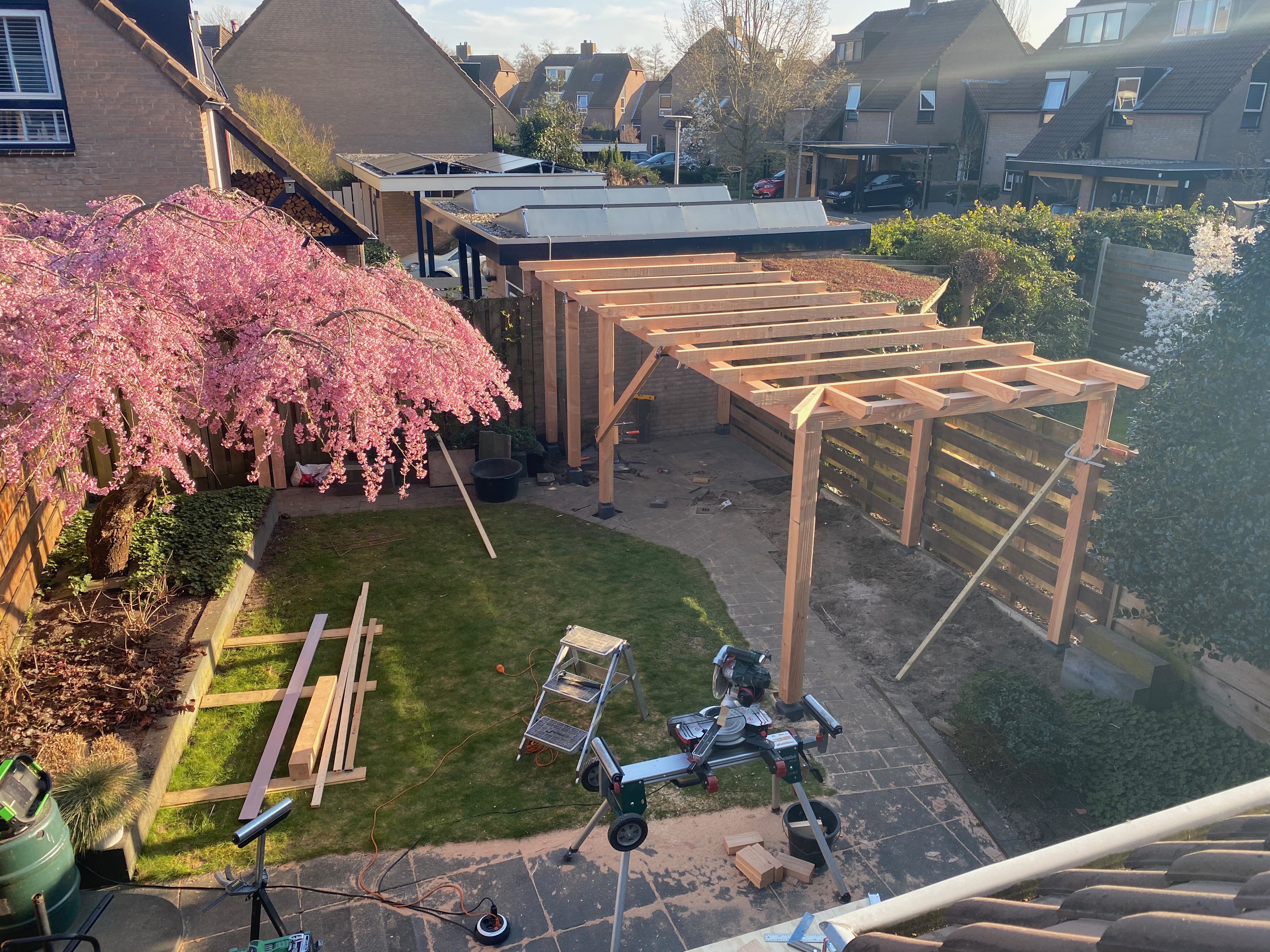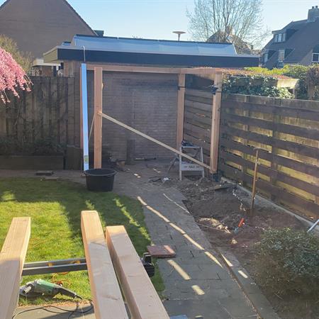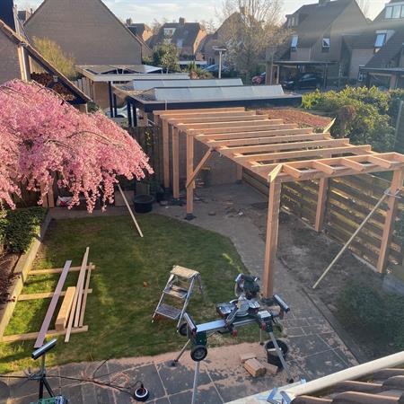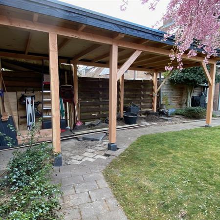 Geheel op maat en naar eigen smaak en inzicht is een luxe tuinoverkapping gebouwd. Geschaafde houten draagconstructie, dakoverstek voorzien van zwarte daktrim. Na het monteren van de hardhouten vlonderplanken is het geheel ingericht met een outdoor lounge-set incl. verlichting en accessoires.